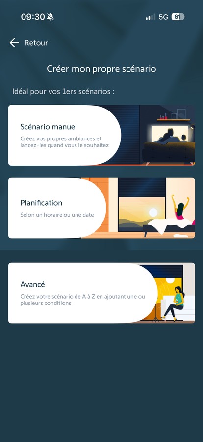 Personnalisez chaque bouton pour créer des scénarios correspondant à vos habitudes : fermer tous les volets roulants le soir, ouvrir le portail et allumer l’éclairage en arrivant, etc. Au total, TaHoma Switch gère jusqu’à 40 scénarios manuels, 20 scénarios planifiés (déclenchement automatique à heure fixe) et 20 scénarios avancés (combinant capteurs, horaires et conditions météo).